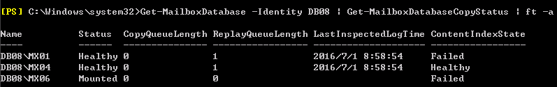 Exchange2010环境中,一个数据库DB08,DAG,目前在Server04装入,但是数据库副本在Server06和01上的内容索引一直失败: