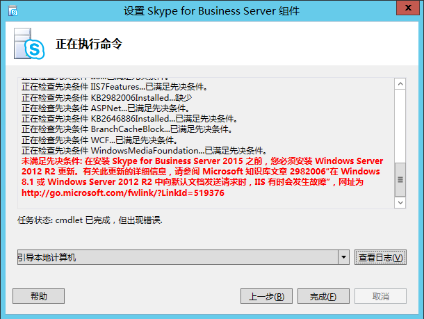 未满足先决条件: 在安装 Skype for Business Server 2015 之前,您必须安装 Windows Server 2012 R2 更新。有关此更新的详细信息,请参阅 Microsoft 知识库文章 2982006“在 Windows 8.1 或 Windows Server 2012 R2 中向默认文档发送请求时,IIS 有时会发生故障”,网址为 http://go.microsoft.com/fwlink/?LinkId=519376