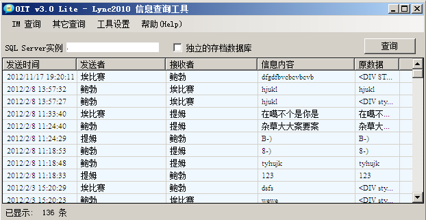在之前2.0版本中,虽然也能查询Lync2010的聊天记录,但是查询结果会有诸多问题