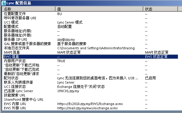 正常 Lync 和 Exchange 整合后 EWS信息应是"EWS 状态正常"