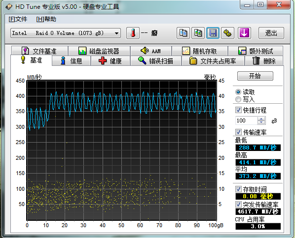 而传输大小32K之后,读取写入均达到了 400M/s, 可见RAID 0 威力不小