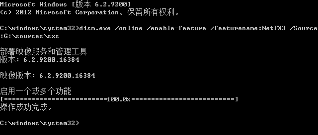 执行“dism.exe /online /enable-feature /featurename:NetFX3 /Source:G:\sources\sxs”