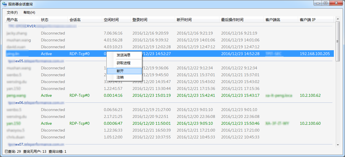 工具还提供 发送消息/断开/注销/查询某用户的进程